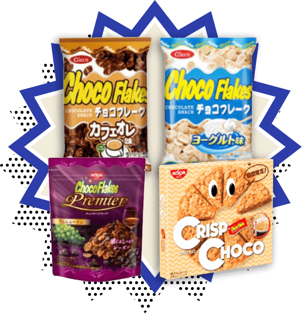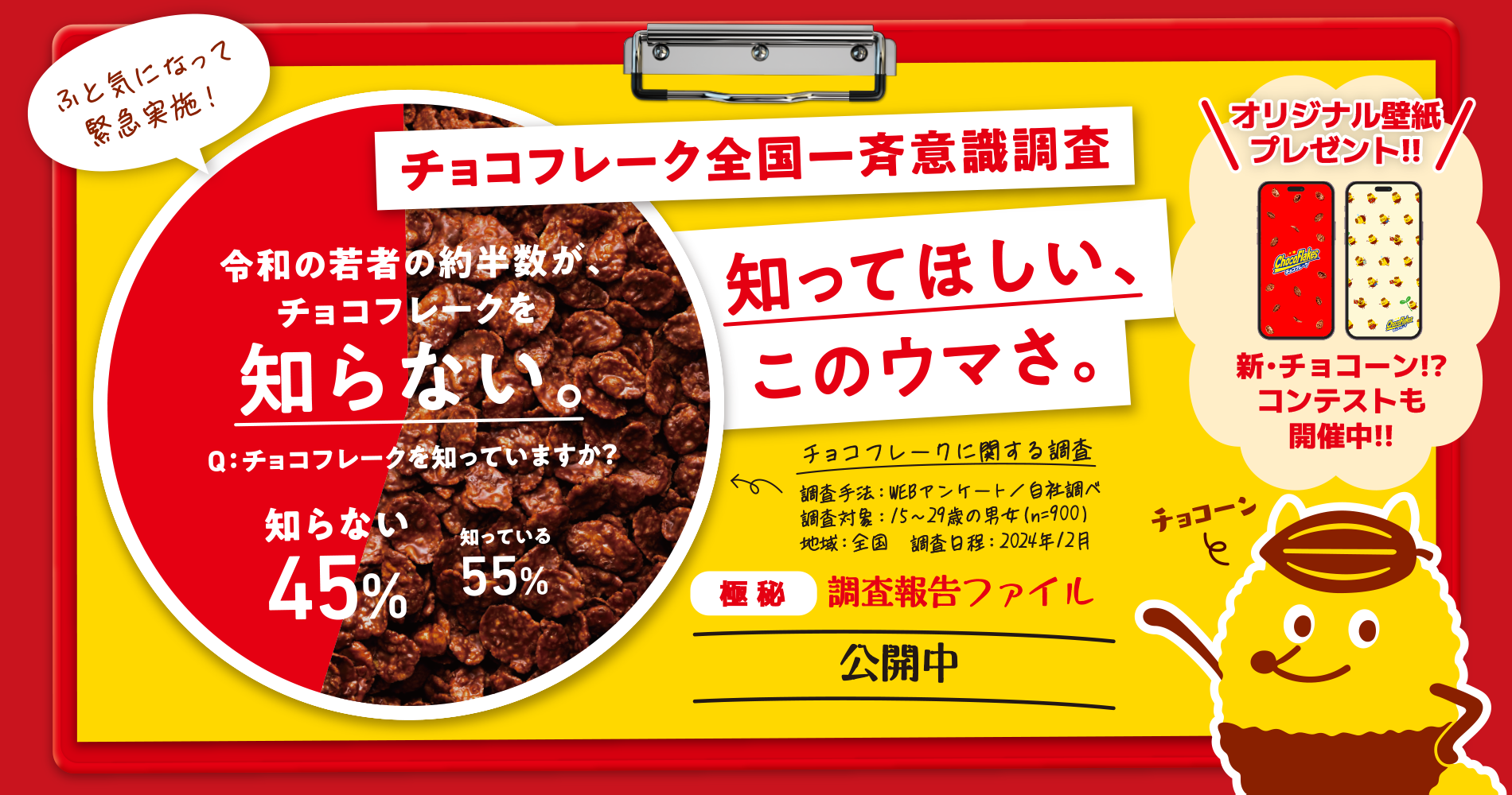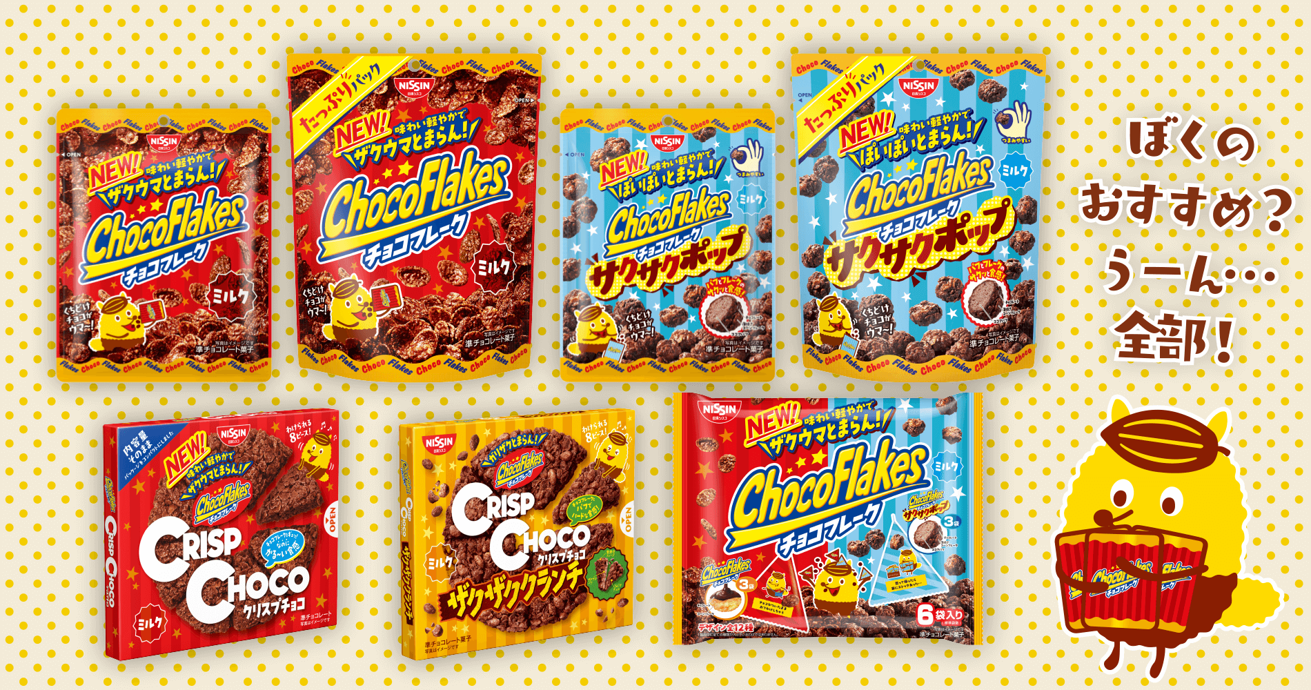 「チョコフレーク ミルク」と「チョコフレークサクサクポップ」の小分けパックをセットにしたアソートパック。内袋は「チョコフレーク」のキャラクター「チョコーン」の「おっチョコちょいな日常」をプリントした三角形のテトラパック(全12種類)。体にうれしい、鉄分、カルシウム入り。