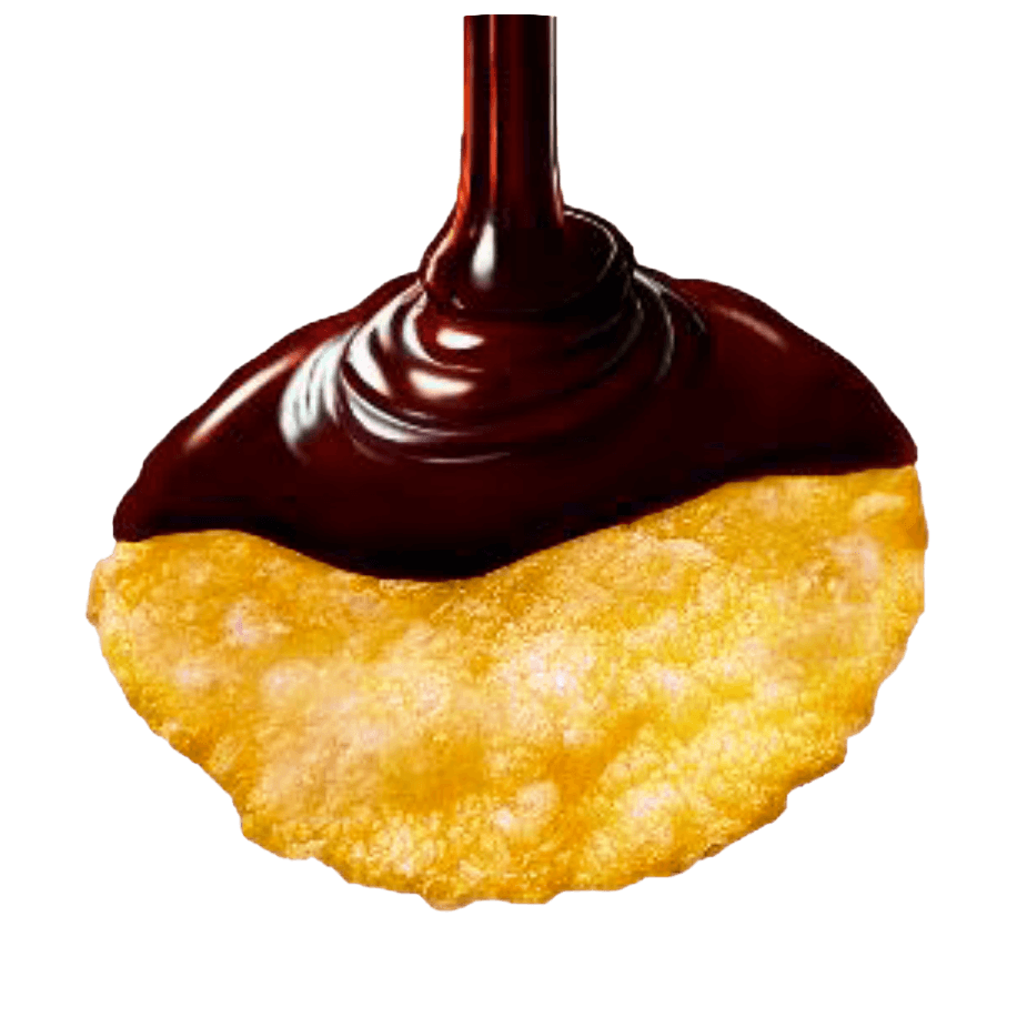 "ガリザクとまらん" おいしさの、ケーキ型チョコスナック。ハード食感のパフと薄焼きコーンフレークをチョコレートで固めました。体にうれしい、鉄分、カルシウム入り。