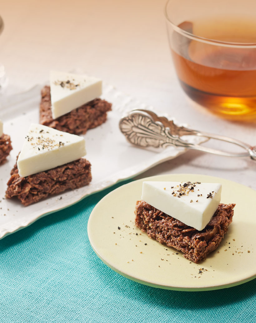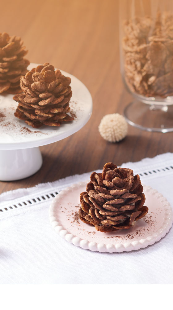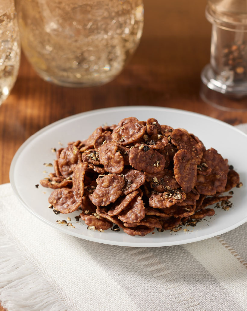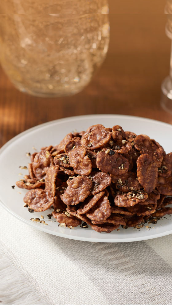 ヘーゼルナッツペーストを使用したジャンドゥーヤ仕立てのチョコレートで、薄焼きコーンフレークとローストしたクラッシュアーモンドを円盤状に固めました。